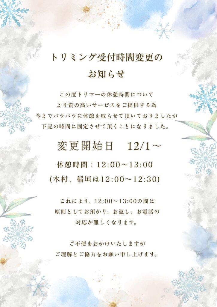 トリミング受付時間変更のお知らせ|りんごの樹動物病院
