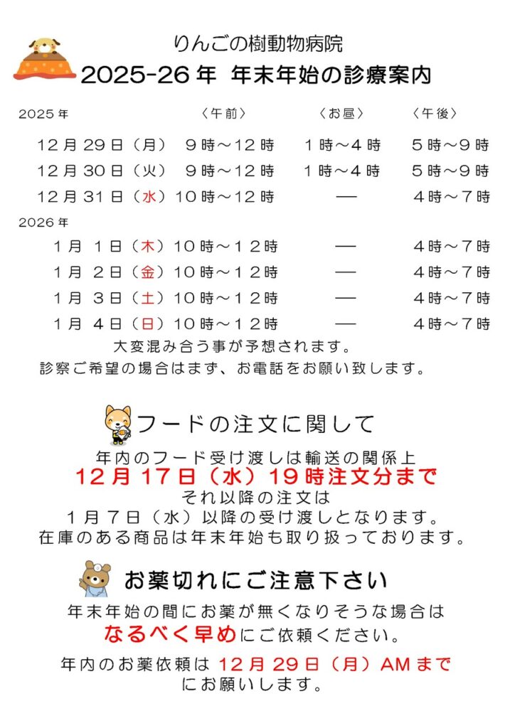 お知らせ一覧 2025.12.15 専門医による特別診察 皮膚科 12月23日(火) 2025.12.08 🎍2025-26年 年末年始の診療案内🎍 2025.12.03 ホテル料金改定のお知らせ(2026年3月宿泊分~) 2025.12.01 トリミング受付時間変更のお知らせ 2025.11.04 専門医による特別診察 皮膚科 11月25日(火) 2025.10.28 ㊗️27周年㊗️ 11月24日(月・振休) 周年祭の開催のお知らせ🎉 2025.10.28 猫健診トライアルコースを受けてみませんか? 2025.10.14 専門医による特別診察 皮膚科 10月21日(火) 2025.09.30 2025年 秋の犬猫健康診断、始まります!🍁 2025.09.03 VESの国際学会(annual conference)に当院院長の近藤が登壇しました 2025.08.29 専門医による特別診察 皮膚科 9月23日(火) 2025.07.30 専門医による特別診察 皮膚科 8月26日(火) 2025.07.29 🎐2025年お盆期間の診療案内とお知らせ 2025.07.21 トリミングルームEPLER アイコンを変更しました 2025.06.25 専門医による特別診察 7月22日(火) 2025.06.02 価格改定のお知らせ 2025.06.01 🐶座談会あり!愛犬介護の不安や悩みを話してみませんか?【愛犬同伴・シニアセミナー】6/7開催 2025.05.30 専門医による特別診察 皮膚科 6月24日(火) 2025.05.22 専門医による特別診察 皮膚科 5月27日(火) 2025.05.21 JSVTM認定 輸血コーディネーター取得 2025.05.19 💉麻酔科ブログ更新(気道を確保するための特殊器具の紹介) 2025.05.19 🐶青空教室シニアセミナー参加者募集中(6/7開催) 2025.05.14 トリミングの料金改定(2025/7/1~) 2025.05.13 お隣のカフェでランチが本格スタート! 2025.04.22 🎏2025年GWの診療案内とお知らせ 2025.04.17 りんごの樹動物病院のお隣に、新しいカフェがOPEN☕ 2025.03.11 🐶パピークラス、「コース制」始めます! 2025.03.06 年間予防パスポート ・健康診断 2025.02.27 [予告]🌸はじまります! 年間予防パスポート2025・健康診断🌸 2025.02.05 📺名古屋の分院が中京テレビに取材されました